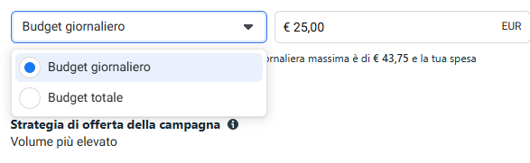 - Imposta preferibilmente un budget giornaliero: Permette una maggiore flessibilità e continuità rispetto al budget totale, evitando di “tornare alla fase di apprendimento” ogni volta che il budget si esaurisce.